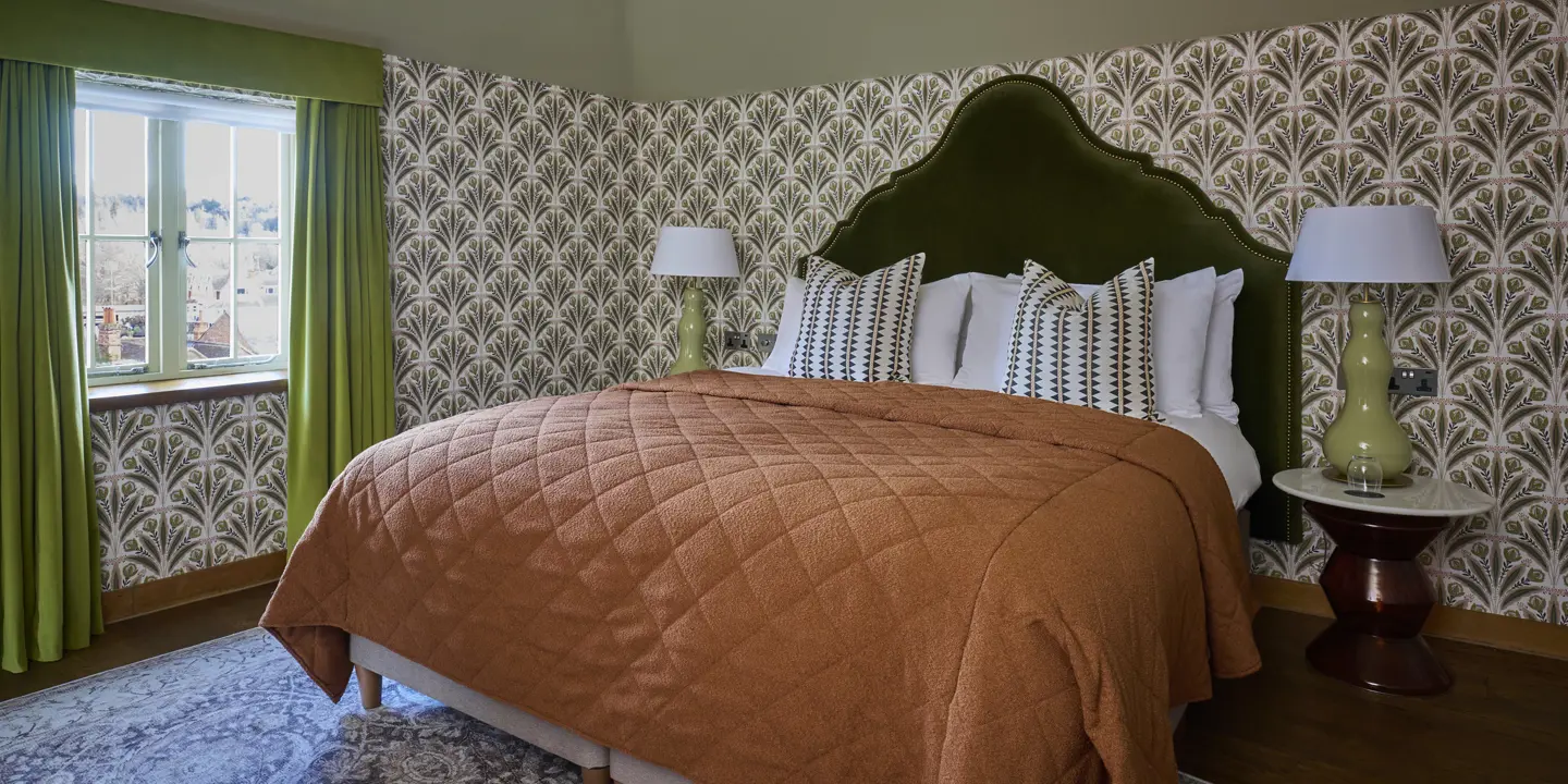 Our Signature Duplex Suites combine a king bed with a split‑level design. One includes a twin wet room, and the other features twin roll‑top baths, a walk‑in shower and a 16ft arched window with church views.